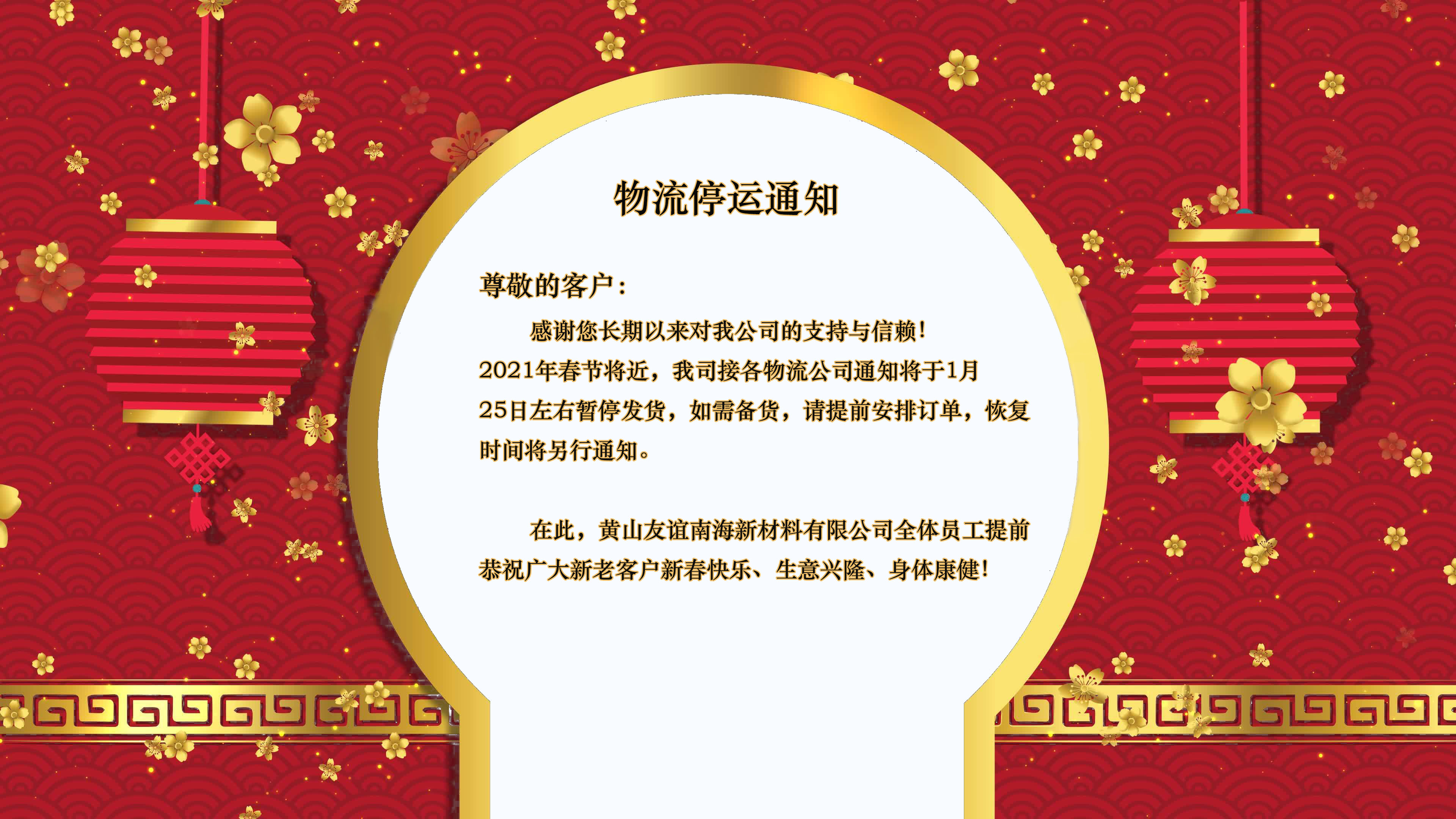 尊敬的客戶:感謝您長期以來對我公司的支持與信賴!2021年春節(jié)將近,我司接各物流公司通知將于1月25日左右暫停發(fā)貨,如需備貨,請?zhí)崆鞍才庞唵?,恢?fù)時間將另行通...