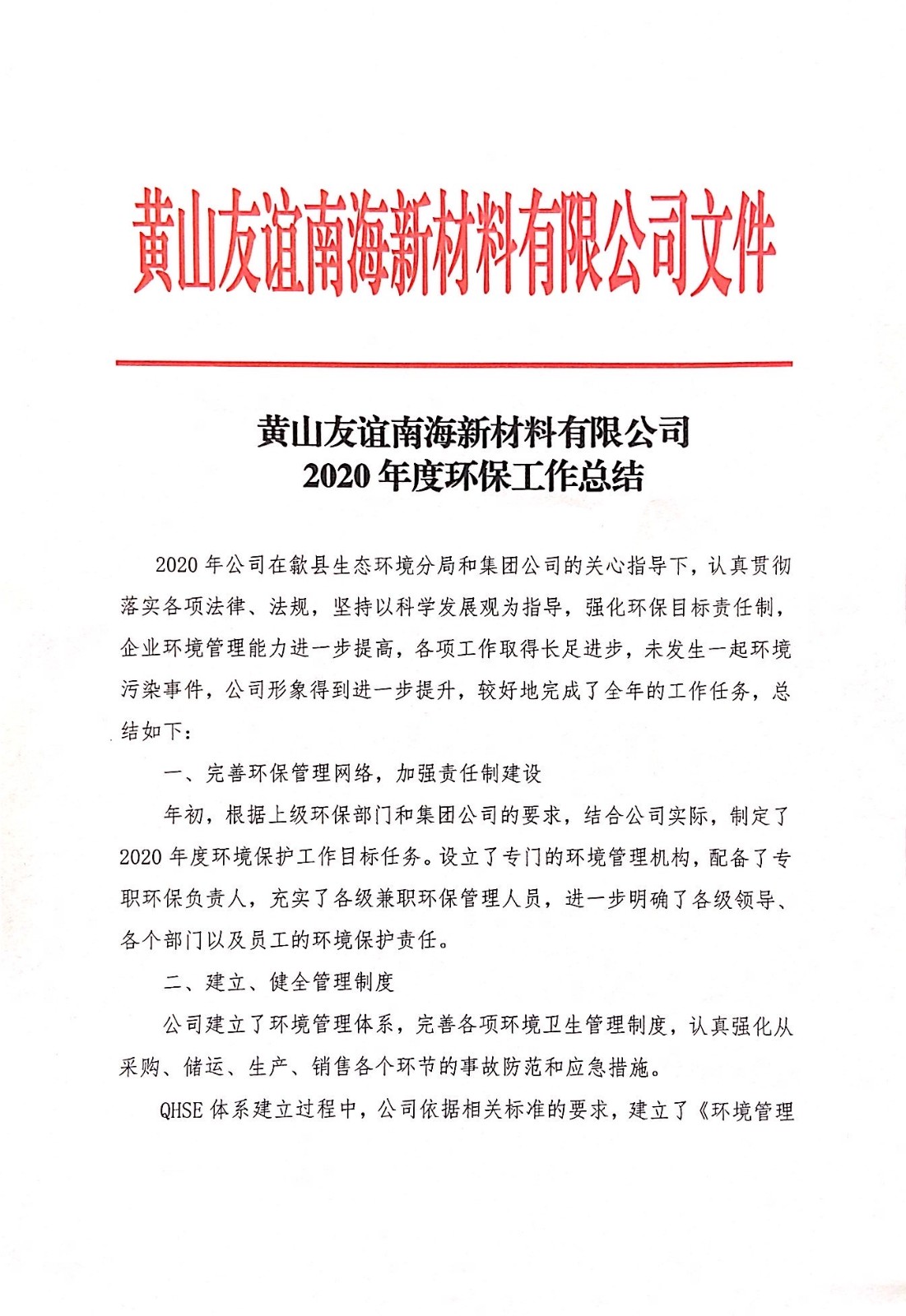 現(xiàn)將黃山友誼南海新材料有限公司2020年度環(huán)保工作總結(jié)的公示公布如下