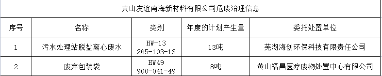 現(xiàn)將黃山友誼南海新材料有限公司2021年度危廢治理信息公開